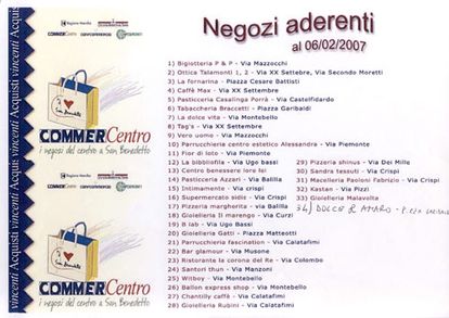 Le previsioni parlano del traguardo 100, come negozi del circuito. Ai cittadini che lo vorranno, saranno distribuite delle cartoline, sulle quali verrano apposti fino a 10 bollini. Ad ogni bollino corrisponde un importo di spesa di 10 euro. Una volta completata, la cartolina verrà riconsegnata al negoziante del circuito Commercentro, il quale provvederà a consegnarla per l' estrazione mensile.