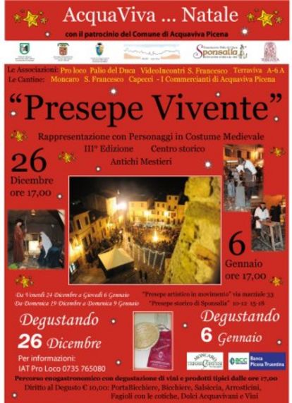 L'iniziativa, patrocinata dell'Amministrazione Comunale, nasce dalla collaborazione dei Commercianti di Acquaviva, della Cantina Moncaro, della Cantina S. Francesco, della Cantina Capecci e della Banca Picena Truentina. Per una più facile visione della rappresentazione è consigliata l'entrata da Porta da Sole, per proseguire lungo Via Marziale, passando per il Trabucco per raggiungere Piazza del Forte.