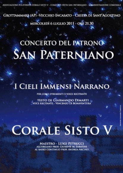 Si terrà mercoledì 6 luglio 2011 alle 21.30 nel suggestivo Vecchio Incasato di Grottammare, presso la chiesa di Sant'Agostino, il concerto della Corale Sisto V in onore del patrono San Paterniano.