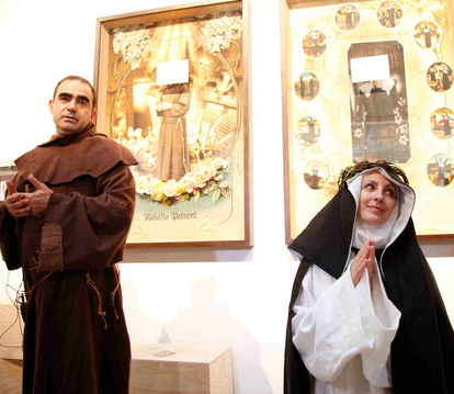 "indignato" che invita i visitatori della Biennale a pentirsi, fino alla Patrona di Padova Santa Giustina che assisa su un trono sculaccia un misterioso uomo-ranocchio in mutanda e cravatta verde.