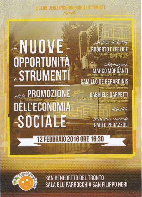 Nella tarda mattinata di mercoledì 10, nell'accogliente cornice culturale della Bibliofila, si è tenuta la presentazione del convegno "NUOVE - Opportunità e Strumenti per la Promozione dell'Economia - SOCIALE", che si terrà il 12 febbraio 2016 alle ore 16,30 presso la Sala Blu della Parrocchia di San Filippo Neri, promosso da "Il Club degli Incorreggibili Ottimisti".