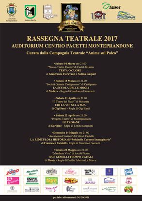 Ad animare il palco dell'Auditorium Centro Pacetti di Monteprandone, da sabato 4 marzo a sabato 20 maggio, ci saranno diverse compagnie teatrali che si esibiranno: "Il Teatro dei Picari" di Macerata, l'"Accademia Creativa" di Città di Castello, "Maschere Vive" di Ascoli Piceno, il "Nuovo Teatro Piceno" di Castel di Lama, il "Progetto Teatro" di Monteprandone e la "Società Operaia Castignanese" di Castignano.
