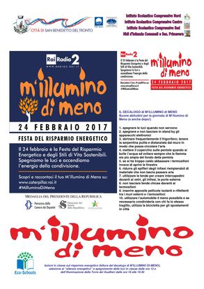 A San Benedetto, sono diverse le iniziative promosse dall'Assessorato all'Ambiente d'intesa con gli istituti scolastici comprensivi "Nord", "Centro" e "Sud". Nelle Scuole Primarie e dell'Infanzia della Città saranno infatti promossi dibattiti in classe sul tema del risparmio energetico mentre agli alunni sarà distribuito l'Eco-codice delle buone abitudini. Nelle classi, inoltre, ci sarà il "silenzio energetico", ovvero saranno spente le luci di tutte le aule dalle 12 fino al termine delle lezioni.