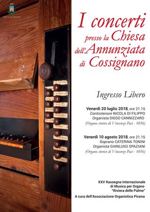 Concerti d'organo e voce, a Cossignano, nella Chiesa dell'Annunziata, ad ingresso libero, con il patrocinio del comune.