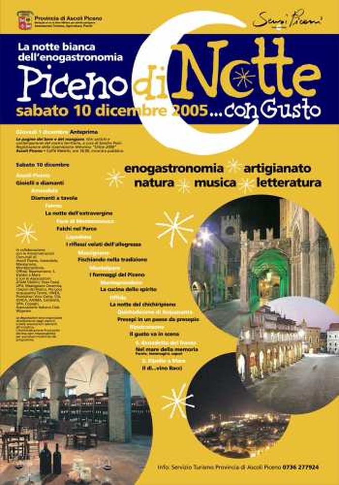 La promozione del territorio e dei suoi prodotti passa anche attraverso la notte. E’ questa la considerazione che ha spinto l’Assessore al Turismo della Provincia di Ascoli Piceno Avelio Marini a promuovere “Piceno di notte….con gusto. La notte bianca dell’enogastronomia” che quest’anno si svolgerà il 10 dicembre in versione numero zero e che dal prossimo anno verrà ripetuta in ogni stagione e su tutto il territorio provinciale. Perché una notte bianca dell’enogastronomia?