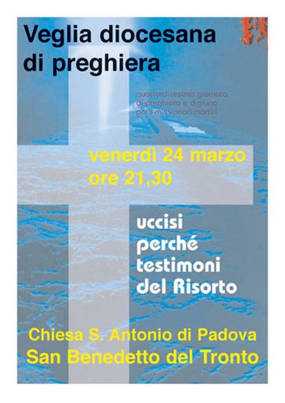 Si terrà venerdì 24 marzo, alle ore 21,30, nella chiesa di Sant'Antonio a San Benedetto del Tronto, una iniziativa importante giunta alla sua quattordicesima edizione: la celebrazione della giornata nazionale dei missionari martiri.