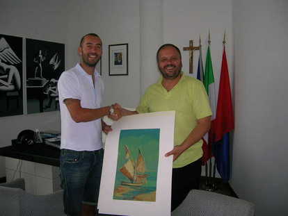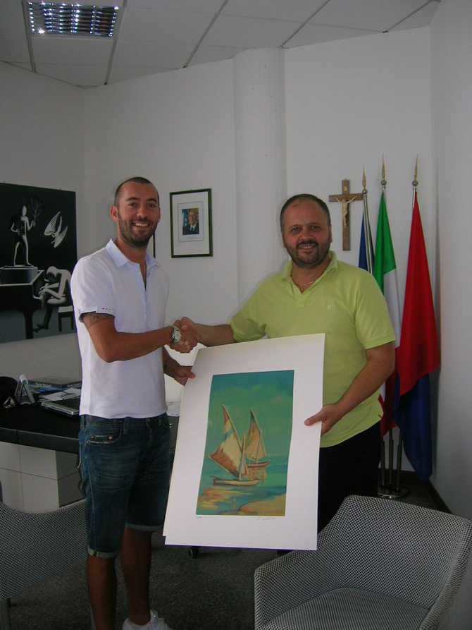 Al termine di un colloquio cordiale e simpatico sugli aspetti tecnici e meno tecnici del mondo del calcio Bucchi ha ricevuto dal sindaco Gaspari una maglietta disegnata da Ugo Nespolo e la litografia di Edoardo Vecchiola "Le vele".